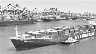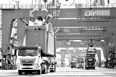 山東港口青島港前灣港區,一艘集裝箱貨輪正進港靠泊碼頭。