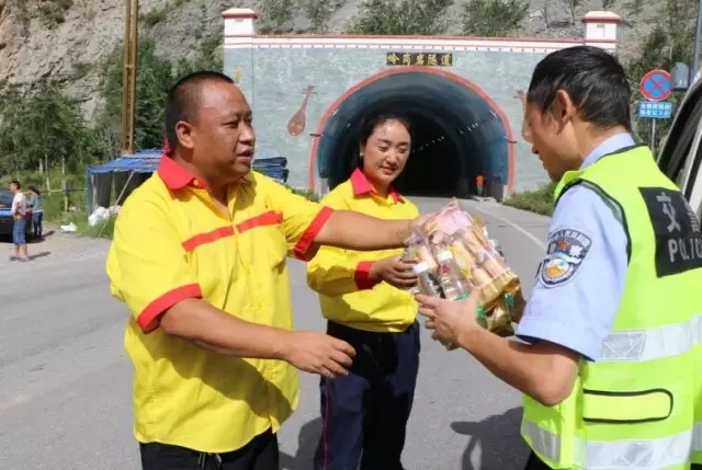 九寨溝片區支部書記廖明為值勤交警送去礦泉水和面胞 杜澤明攝