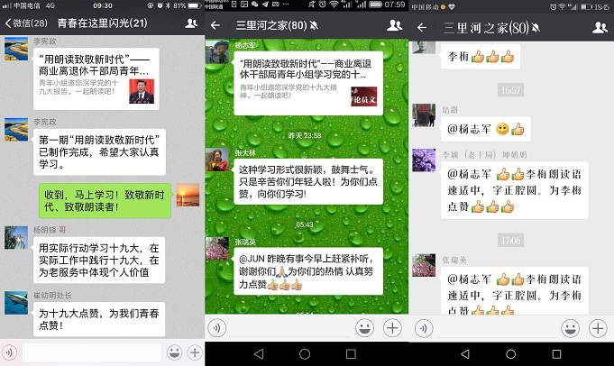 “用朗讀致敬新時代”的首季活動,便是全文朗讀黨的十九大報告,以這種方式帶領全局廣大黨員和離退休干部學習黨的十九大精神。根據報告的內容結構,我們將報告分成若干部分,每個部分由一位同志進行朗讀,大家接力朗讀,完成學習內容。朗讀的語音和文字內容在微信公眾號上發布,再分享到我局在職人員和老同志的微信群、朋友圈中,確保大多數人都能收到、能聽到。