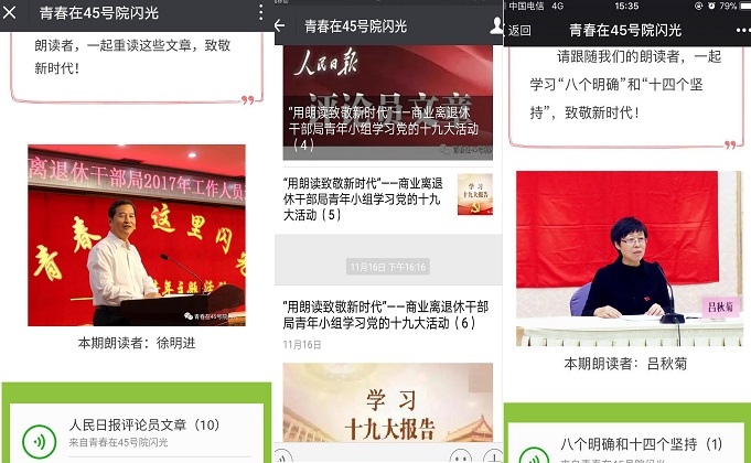 2018年4月16日,“青春在45號院閃光”微信公眾號發布了第62期“用朗讀致敬新時代”系列活動信息。截至這一天,商業離退局青年小組用了158天的時間,通過新媒體平臺,分62期完成了對習近平新時代中國特色社會主義思想和黨的十九大精神等相關內容的學習。該活動是商業離退局青年小組聚焦學習習近平新時代中國特色社會主義思想,在創新學習方法、提升學習效果方面進行的一次有益嘗試。