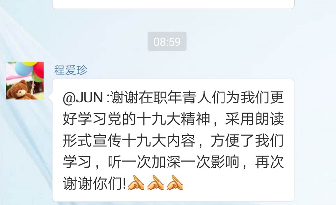 在(zai)活(huo)動(dong)(dong)開展的(de)過程(cheng)中,我們(men)以學(xue)習黨的(de)十(shi)九大精神為主題,不斷拓展學(xue)習內容:將(jiang)《人民日報》刊發的(de)十(shi)期(qi)(qi)評(ping)論員文章納入朗讀(du)范圍;將(jiang)黨委中心組民主生活(huo)會提出的(de)重(zhong)點學(xue)習“八個明確”和“十(shi)四(si)個堅持”基本方略,用(yong)四(si)期(qi)(qi)朗讀(du)進行強化(hua)學(xue)習,使朗讀(du)活(huo)動(dong)(dong)達到了帶動(dong)(dong)學(xue)習、深化(hua)學(xue)習的(de)目(mu)的(de),在(zai)廣大黨員特別是老同志中起到較好(hao)的(de)學(xue)習效果。2018年,我們(men)再(zai)接再(zai)厲,開啟了第二季“用(yong)朗讀(du)致(zhi)敬新時代”活(huo)動(dong)(dong),用(yong)十(shi)六期(qi)(qi)朗讀(du),完成了對新修訂《黨章》的(de)學(xue)習。